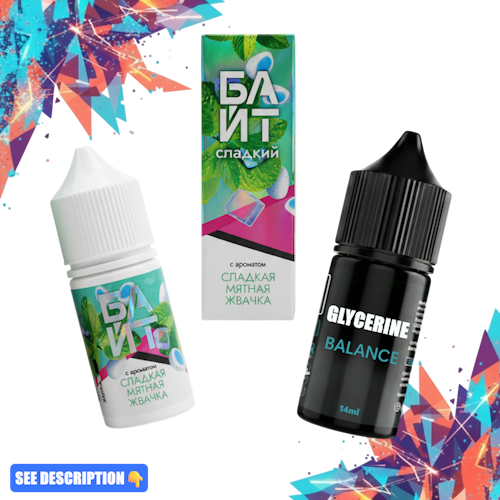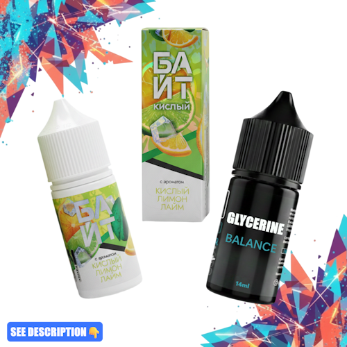 В КОМПЛЕКТ ВХОДЯТ: ГЛИЦЕРИН И АРОМАТИЗАТОР С ЯРКИМ ВКУСОВЫМ РЕШЕНИЕМ. ВАМ ВСЕГО ЛИШЬ НУЖНО ВЫБРАТЬ ВКУС, СМЕШАТЬ И ВЗБОЛТАТЬ В ТЕЧЕНИЕ 1-2 ЧАСОВ. ПРИ ЖЕЛАНИИ МОЖНО ДОБАВИТЬ БУСТ ДЛЯ УСИЛЕНИЯ ЭФФЕКТА.